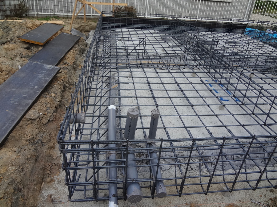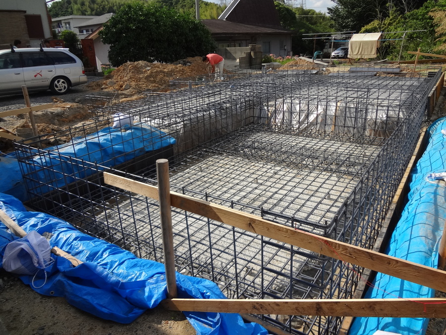 その後、基礎の骨となる鉄筋を組む『配筋工事』を行い、コンクリートを形作る『型枠組み』となります。