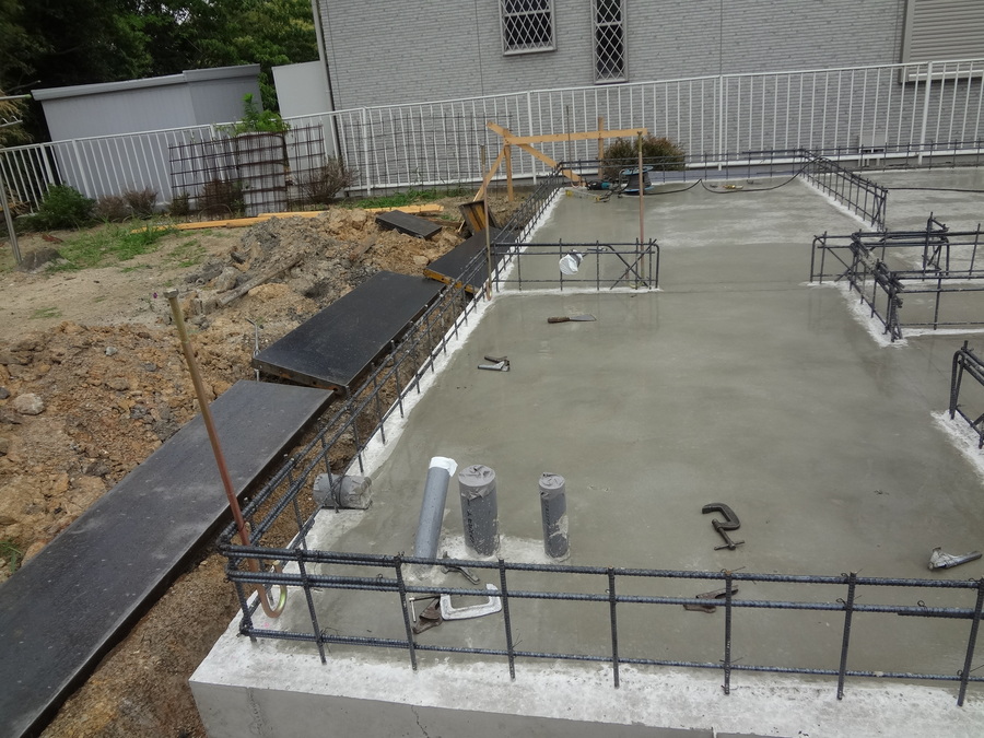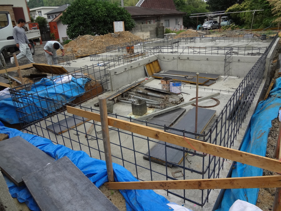 『配筋工事』が終わり、後日、『コンクリート打ち』が、底板部分と、立上がり部分の2回に分けて行われます。