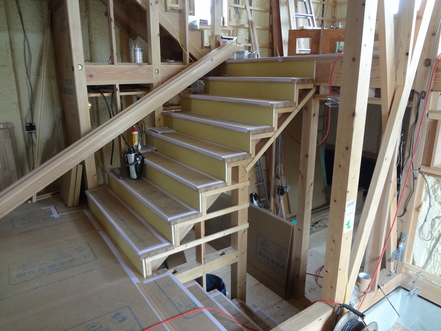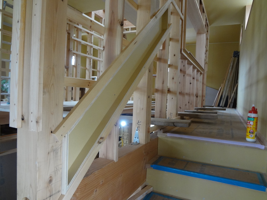 メイン空間の大階段。集成材を階段状に加工して、その上に合板を貼ってたわまないよう強度を出します。