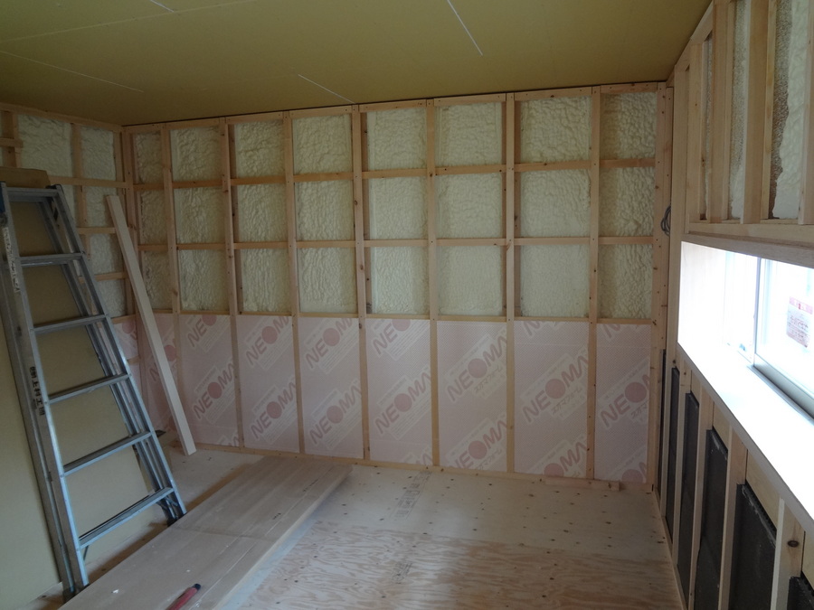 天井下地 → 吹付け断熱 → 壁下地 の順で進んでいきます。 非常に丁寧に仕事をしてくれています。