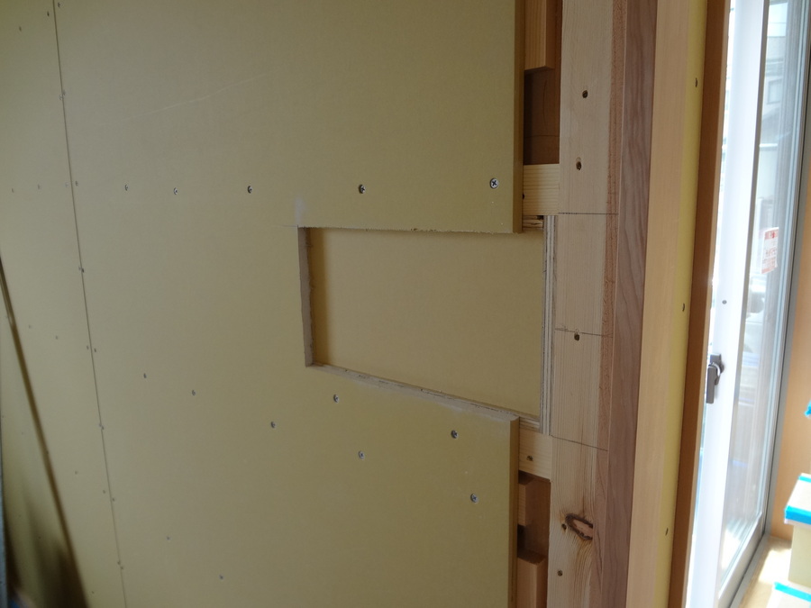 分かりにくいですが、窓の部分にボードの交点が重ならないようにして、仕上材の割れを抑えています。