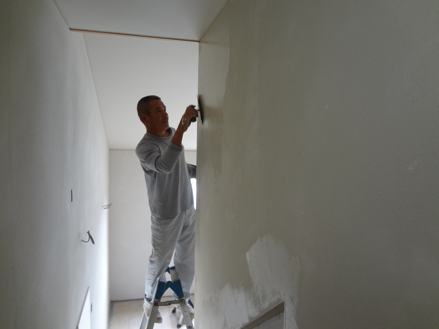 今回は、お施主様のお父さんが左官屋さんなので、自ら珪藻土を塗ってくれています。