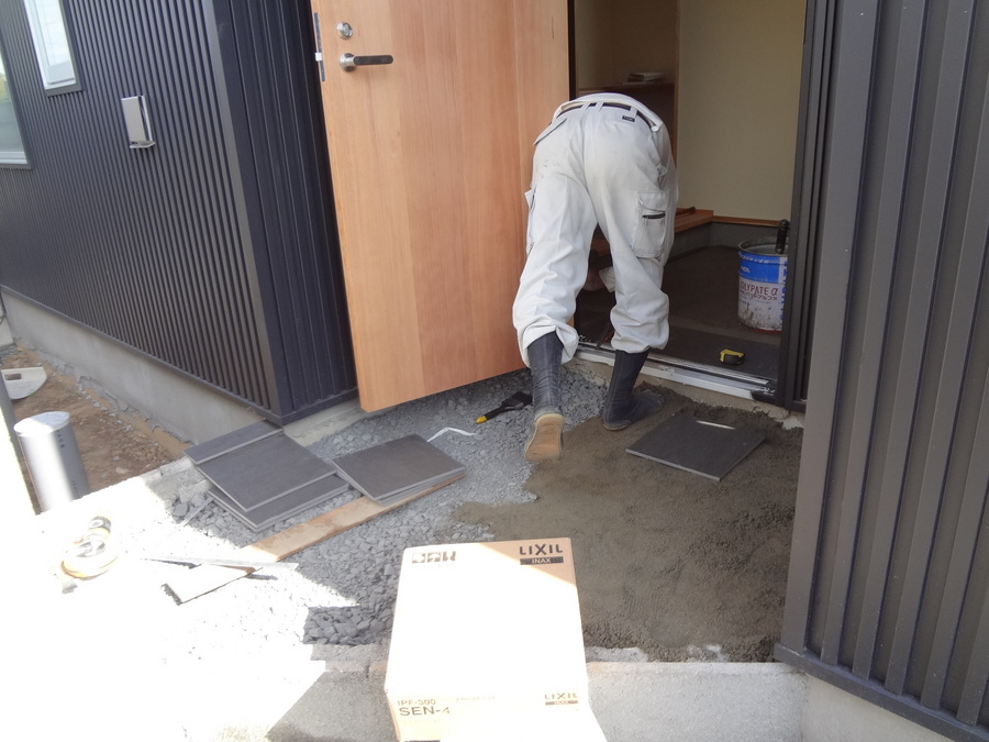玄関のタイル貼りの作業風景です。土→砂利→モルタル→タイルと敷いていきます。