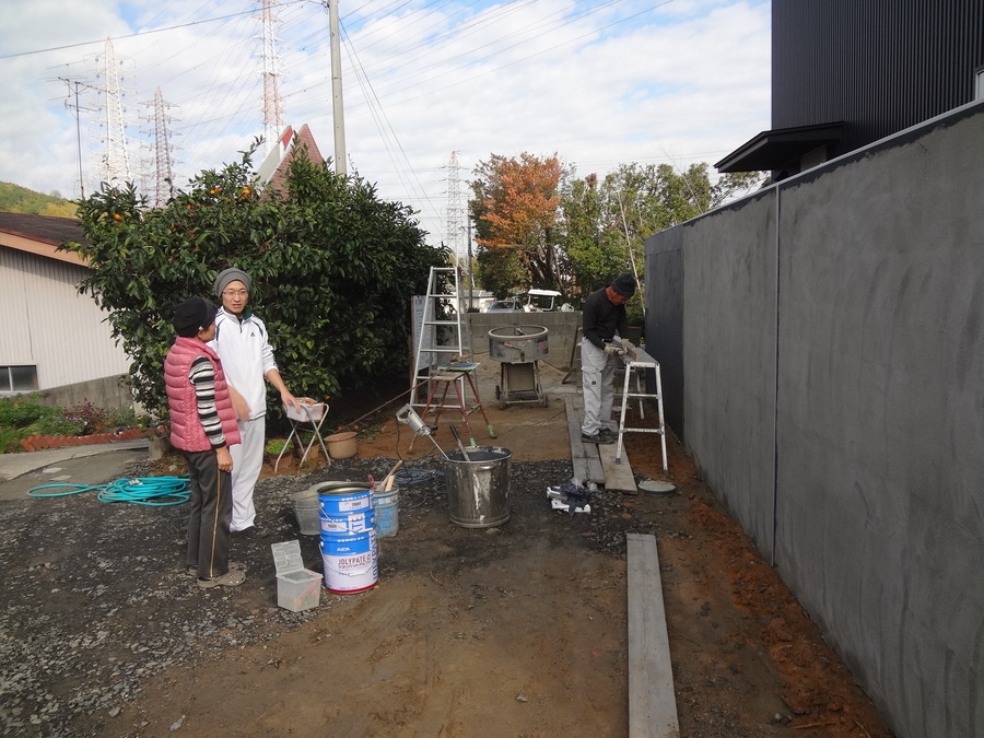 目隠し塀に下塗りをして、仕上げ材のジョリパットを塗っていきます。