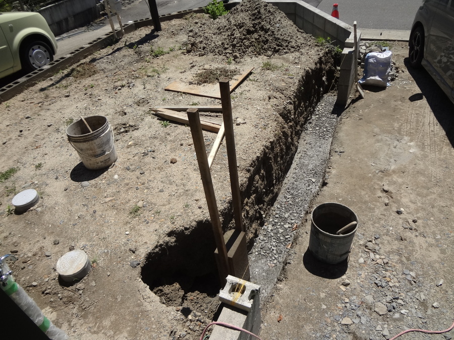 建物基礎の施工と同じですが、締固めがしっかりしていないと凹凸やブロックの倒れる原因になります。