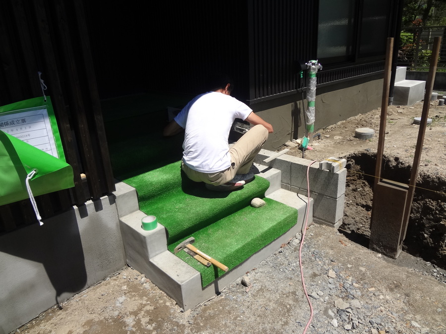 階段部分の施工が終わり、基礎部分の化粧モルタルを施工してもらっている最中です。