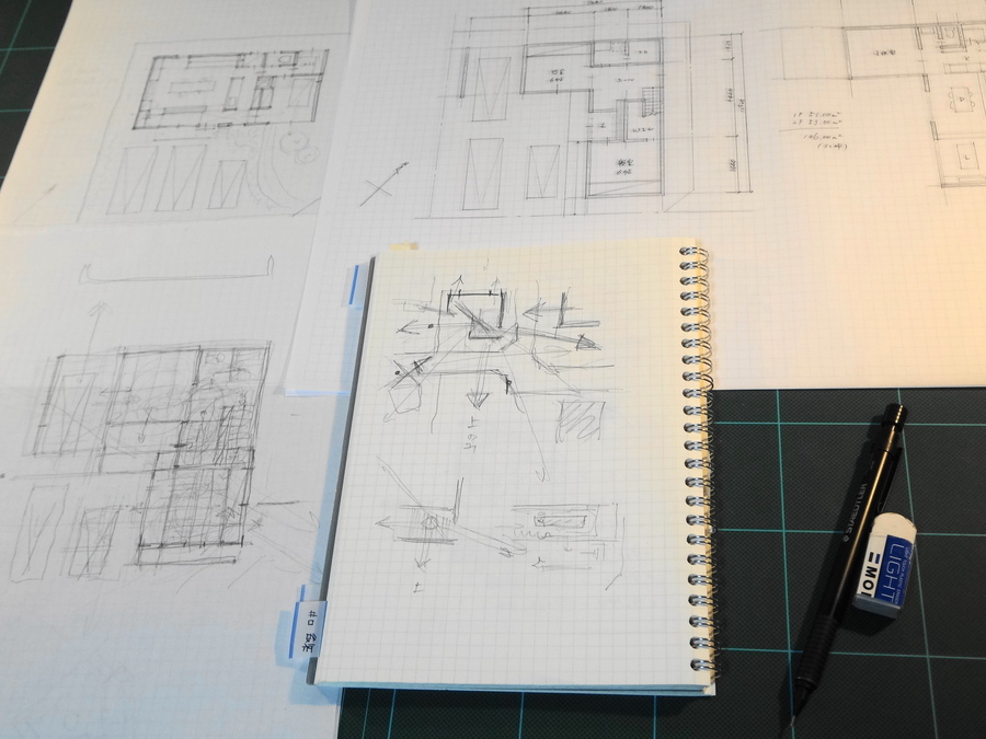 提案した図面が上手くいかない時は、写真のようにスケッチに戻って基本設計を何度も繰り返します。