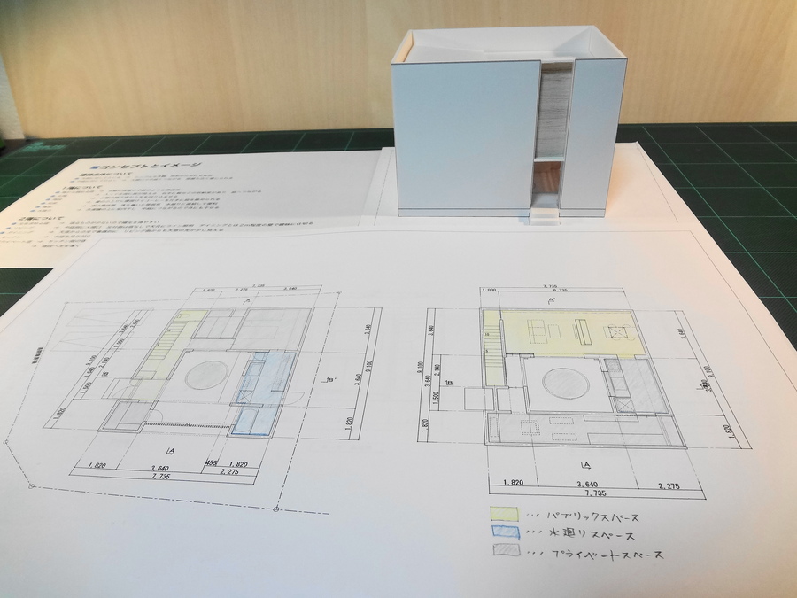 手前:平面図(縮尺:1/100) 右奥:模型(縮尺:1/75) 左奥:コンセプト提案書